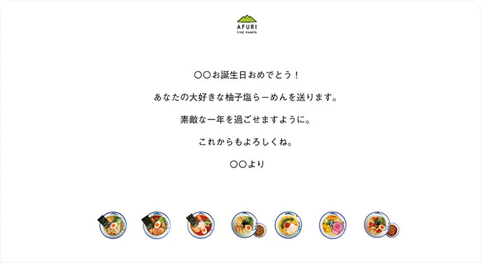 We will send AFURI ramen, merchandise, and other gifts in an AFURI original design gift wrapping.